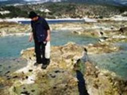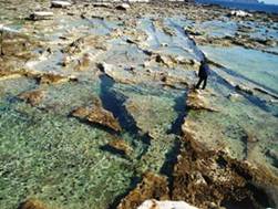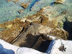 Nektek, nyáron, ha erre látogattok, nem lesz ilyen szerencsétek, hogy ezeket felfedezzétek. Amikor a tenger 10 C fok körüli és nincs erős széljárás, a tenger vize nagyon visszahúzódik. Így sikerült nekem lencsevégre kapni az egykori kikötő maradványait. Nézzétek meg a terület nagyságát. Pánosz áll a terület közepén. Normál esetben legalább 1 méteres víz fedi ezt a rész, megközelítése lehetetlen. Látjátok, hogy részben a kővágások, kihasítások mentén éles részek maradtak, amik 2 méteres szakadékokat is képezhetnek. A kő felülete most is csúszós, különféle kagylók vannak rátapadva, és mindenhol teli van tengeri sün telepekkel.