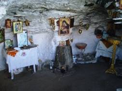 Teljes meglepetésemre, ez a kis kápolna most ezen a téli napon is tiszta, gondozott volt. Senki nem lakik a környéken. Ki gyújthatta meg az oliva mécseseket? Döngölt földpadlója frissen felseperve, sehol egy elszáradt fenyő tűlevél. Az innen 10 km-re levő Mihály Arkangyal kolostorból járhatnak ide az apácák? Elképzelhető. Ez a kis barlang már az ókorban is egyházi célt szolgált. Erről tanúskodik egy–két írás.