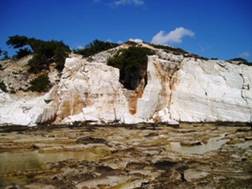 Utatokat folytatva szép a kilátás vissza a tavernák felőli öböl részre, ill. a partszegélyről Livadia öböl ormai magasodnak festői képet mutatva felénk.Ahogy a kanyarhoz értek, ott most van egy elkerített rész. Egy barlang van az ösvény alatt, aminek a teteje omlásveszélyes. Ezután találhatjátok az első ismertető táblát.