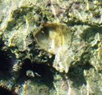 Ezt sztidjának hívjuk. Magyarul: osztriga? Nem volt időm lefényképezni, hogy néz ki eredetileg, mert azonnal megette. Ezt a kőre rátapadva képzeljétek el, mint egy őskőzetet. Ha mozdulatlanul tudod megközelíteni, nyitva van a szája, és az élénk narancssárga belsőt lehet már távolról meglátni. Amint megmozdul a víz, összecsukódik és a terepszíne miatt nehéz újból megtalálni. A lefejtése még nehezebb. A legjobb az erősacélú búvárkés. Egy hirtelen mozdulattal lehet szétfeszíteni, mielőtt be nem csukódik. Nekem az idén a nyár végére sikerült először több év után nem csak felfedezni, hanem 5-6 db-ot kinyitni.