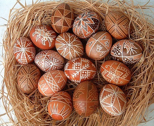 A tojásfestés népszokásként elsősorban Kelet-Európában maradt fenn a XXI. századig. Eredetileg egyszínűek voltak, pirosas színüket növényi festőanyagoktól kapták. Erre szolgált a vöröshagymahéj, a börzsöny, a bíbortetű. Később kialakultak a feliratos tojások. A díszítést viasszal „írták” a héjra, melyet festés után lekapartak. Lehetett a szöveg név, üzenet, esetleg a keresztény jelképek valamelyike. A minták ismerői tojásfestéssel foglalkozó asszonyok voltak, akiktől a lányok megvásárolták azokat.