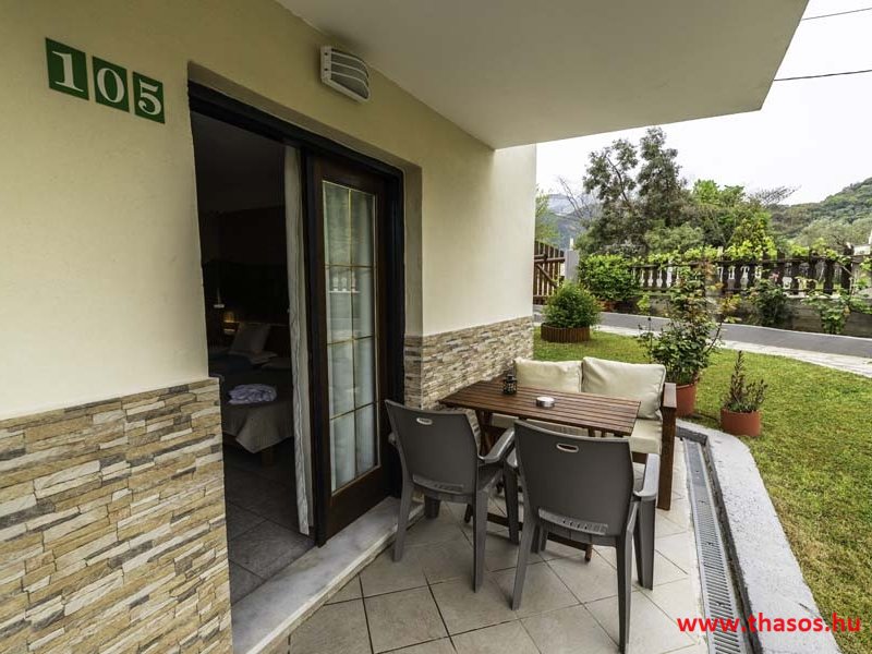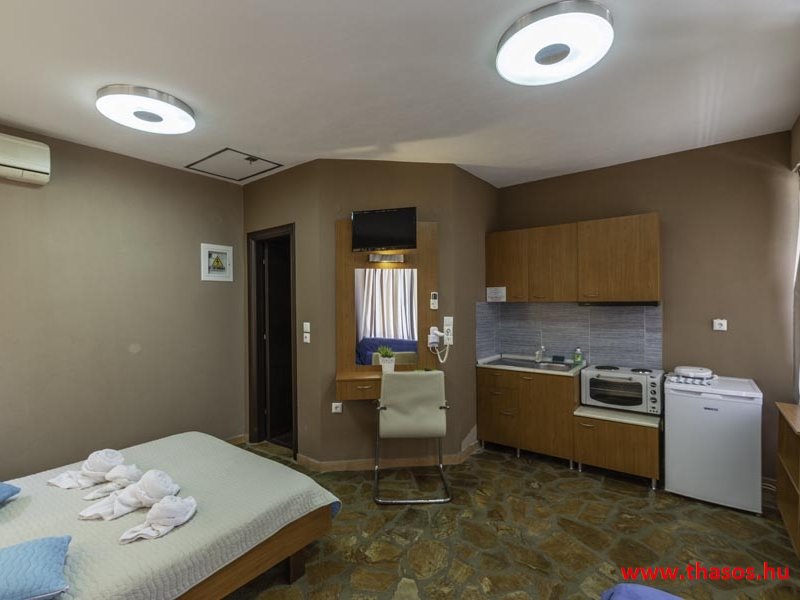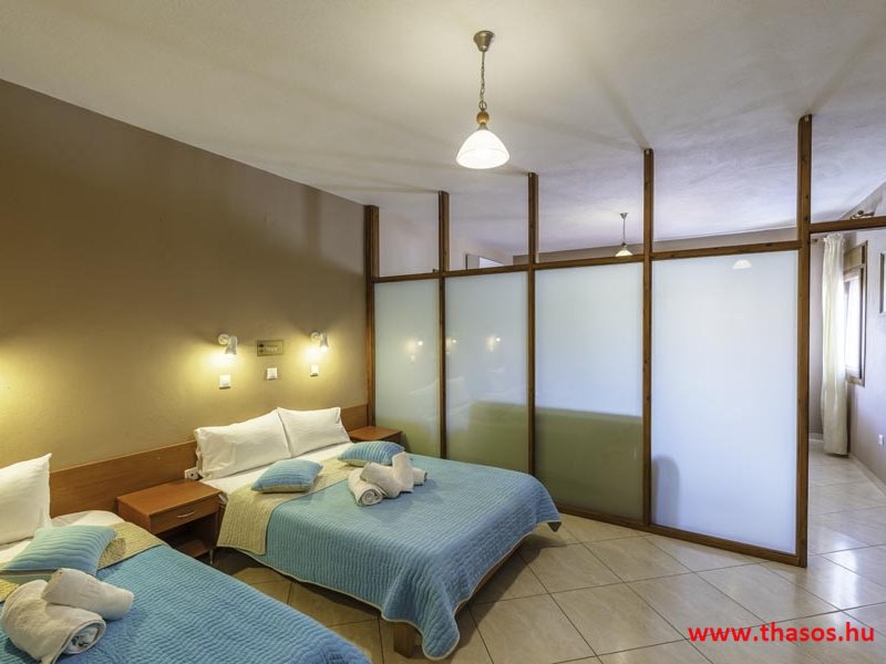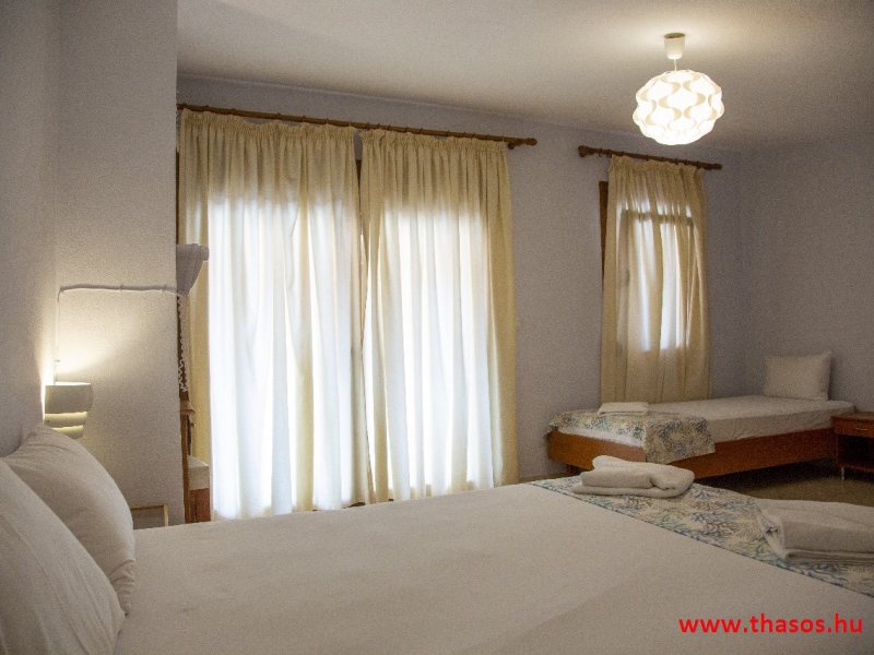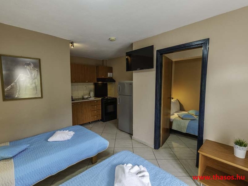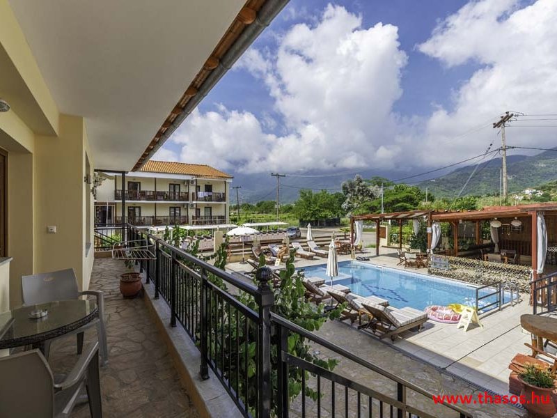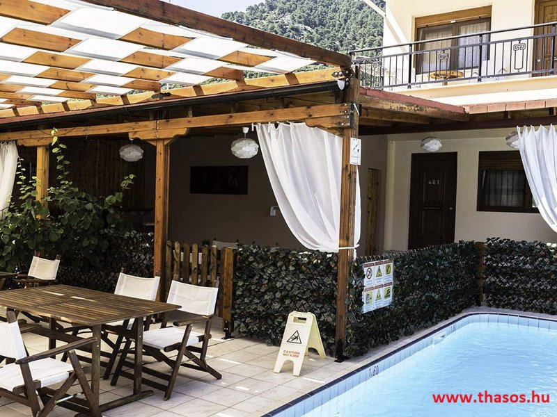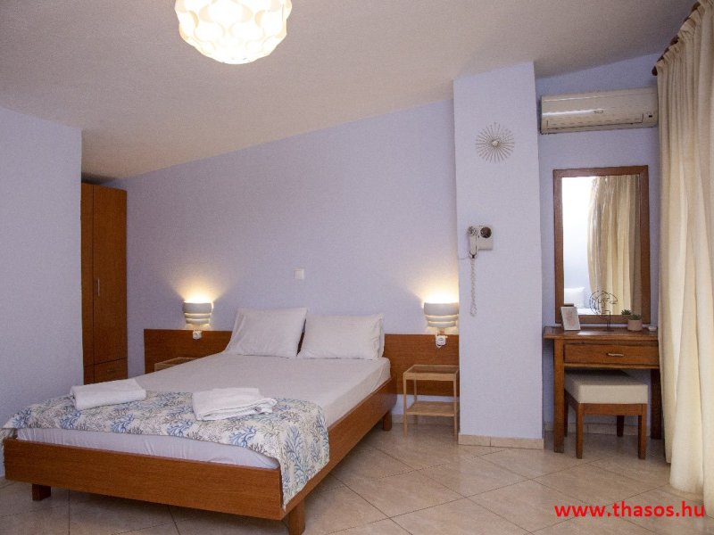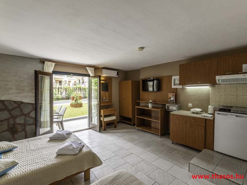 2026. évre új élet költözött ebbe a szálláskomplexumba. A gyönyörű szállás Skála Panagia camping part területe felett van. A szállás csupán néhány lépésre áll az Égei-tenger türkizkék vizétől és a híres Chrysi Ammoudia, azaz Aranypart strandtól. A közelben kristálytiszta vizű strandok, helyi taverna éttermek hagyományos ízekkel és festői ösvények találhatók, ahol sétálhat a tengerparton. A komplexum közepén egy lenyűgöző közös medence, amely ideális hűsítő csobbanásokhoz és pihenéshez a görög nap alatt. A medence speciális biztonsági intézkedésekkel van ellátva a gyermekek számára, hogy biztonságos és gondtalan élményt nyújtson a családok számára. Kényelmes napozóágyakkal és árnyékos területekkel van kialakítva, ideális környezetet teremtve a medencézés élvezetéhez. A lakások része a teljesen felszerelt konyha gyors ételek elkészítéséhez, valamint a hűtőszekrény. A lakások erkélyei tágasak, berendezettek, mint egy kis privát oázis. Ez a ház családi nyaralásra vagy párok részére ajánlott, kik természeti kalandokra vágynak. Teljesen felszerelt stúdióink és apartmanjaink ötvözik a modern kényelmet és az autentikus görög hangulatot. Csodálatos kilátást a tengerre és a zöld hegyekre. A ház közelében az ellátottság biztosított. Skála Panagia öböl közép-keleti részén mi található, mely a nyaraló vendégek ellátását szolgálja? Szupermarket, hentes, pizzériák, gyros tavernák, halas tavernák, kis kocsmák, élőzenés éjszakai parti taverna mind a szálláshoz közel. Élet és nyugalom harmonikusan. A szálláshoz tartozó partszakasz az öblünknek a kempingnél lévő lassan mélyülő, márványporos, hosszú bemenetellel, sekély, meleg vízzel rendelkező része. Lehetséges a napágy bérlés is, de lehetőség van saját törölközős csendesebb partszakaszt is választani. Ami miatt még igen kedvelt ez a partrész, az a három típusú vízisport lehetőség. Három vállalkozó bérel itt helyet: vízi sport, vízi járművek és kifejezetten kisgyermekesek részére vízi paradicsom ugráló is választható. A szálloda vendégeinek egyik legszebb élménye a különleges medencénkben való fürdőzés. A ház komplexuma rendelkezik kétágyas egy légterű stúdiókkal, háromágyas egy légterű luxus stúdióval, mazonett belső szintes apartmannal és a normál egy hálószobás apartmannal. Mindegyike kényelmes, magas színvonalú. Hangulatuk nyugodt, barátságos és kellemes. A vendégek maximális kényelme érdekében a lakások úgy lettek kialakítva, hogy a meghatározott számú személyt tudjanak befogadni, és nincs lehetőség pótágyak hozzáadására. Ez biztosítja az elegancia és a funkcionalitás ideális egyensúlyát, megőrizve a tágasság és a kényelem érzését. Egy légterű stúdió lakásai : Egyedülálló szállásélmény a fényűző és világos stúdióban, amely ideális azoknak a pároknak, akik eleganciát, kényelmet és nyugalmat keresnek. Modern kialakításával és kiváló minőségű felszereltségével ez a szálláshely ötvözi a luxust a hangulatos légkörrel, így tökéletes helyet teremtve a pihenésre és a feltöltődésre. A hálószobás apartmanok: Tágas, kényelmesen berendezett nappali - étkező, teljesen felszerelt konyhával rendelkeznek . A különálló hálószoba ideális környezetet biztosít a pihentető alváshoz, míg az elegáns belső kialakítás ötvözi a modern esztétikát a praktikummal. Tartózkodását további szolgáltatások teszik még kellemesebbé, mint például a műholdas TV a szórakozáshoz, a széf a személyes tárgyainak biztonságához és az ingyenes piperecikkek a modern fürdőszobában. A ház teljes korszerűsítése a mai friss színekkel, bútorokkal, anatómiai ágybetétekkel, stb. 2025 szezonzárás után történt, amiről szezonkezdet előtt fotógaléria frissítést teszünk. Addig is a régi képek állnak rendelkezésünkre. Superior stúdió Kétágyas stúdió Apartman Maisonette Executive stúdió Standard háromágyas szoba, földszinten Standard családi apartmanszoba, földszinten Basic háromágyas szoba, 1. emelet Basic családi apartmanszoba, 1. emelet Medence felőli oldal: Kert felőli oldal: A megadott ár tartalmazza az extra, helyben fizetendő turisztikai adót is. A mazonette és az apartman esetén az árak 4 fő/éjszaka/lakásra vonatkoznak. Azok lehetnek 5 fősek is. Térítési díj az extra főre 10 Euró/éjszaka/mazonette vagy apartman lakás. Egyéb lakások nem pótágyazhatók. Összesen 20 lakással rendelkezik a teljes házkomplexum. Közvetlen medencés lakások, mazonettek, apartman és a standard lakások. Egy lakás esetén: Érkezés és a lakás elfoglalása 14:00 órától. Távozás és a lakás átadása: 10:00 - 11:00 óra között. Képek a szállásról Superior stúdió Kétágyas stúdió Apartman