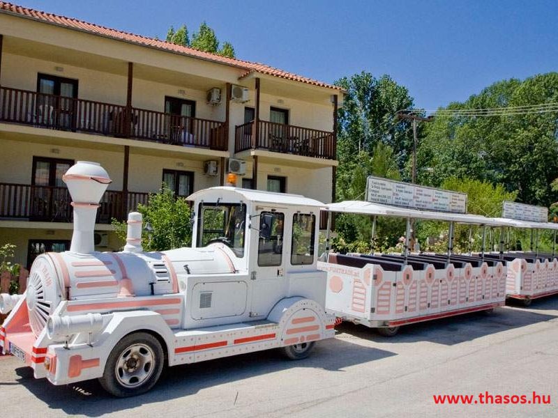 Az öböl caf-cuf kisvonatja, mely Skála Panagia és Skála Potámia közt zakatol, immár új családtag vezetővel közlekedik. A kisvonat tulajdonosainak szállása a Joanna - Mária Apartman és Stúdió.