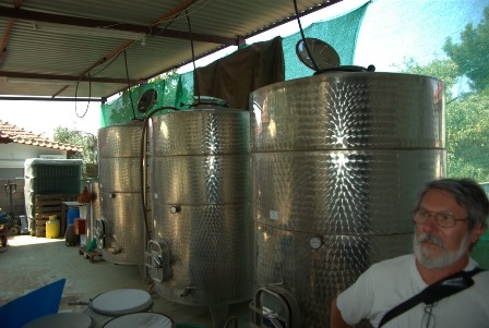 Giannakis úr mesél. Ahogy látja rajtunk az érdeklődést, hogy nem csak megkóstolni akarjuk a borát, egyre lelkesebben. Mutatja a feldolgozó gépeket, a bogyózót, amellyel a szemeket a fürt kocsányairól leválasztják, a darálót, a prést.