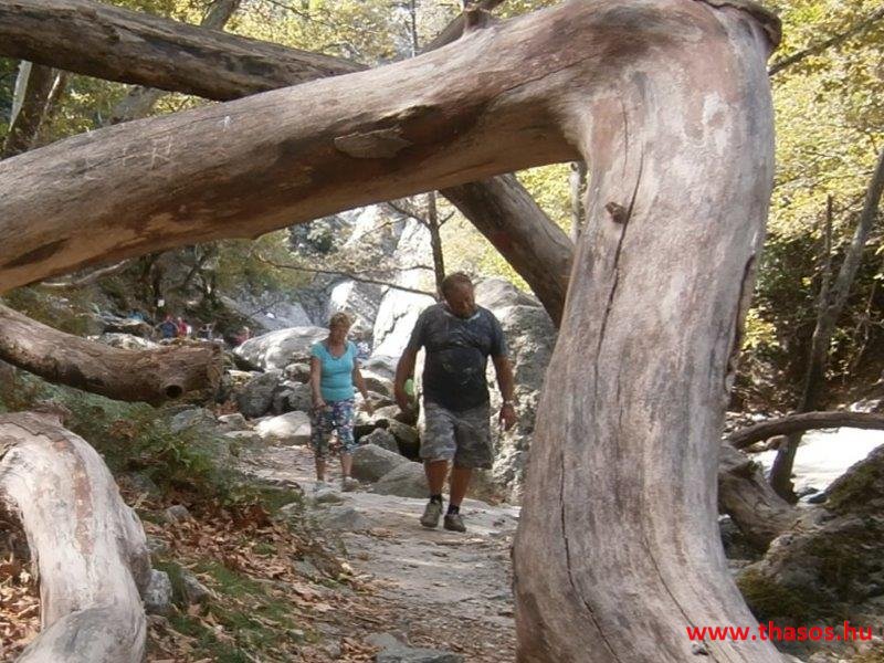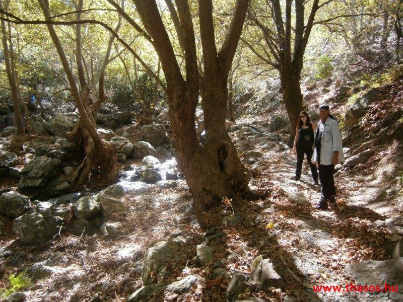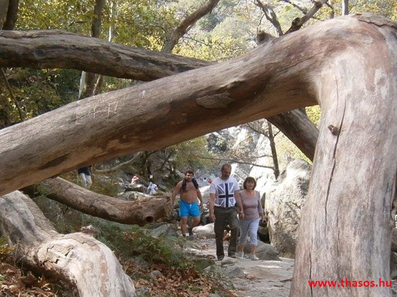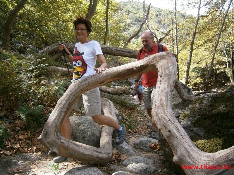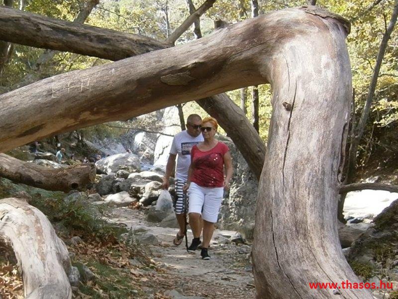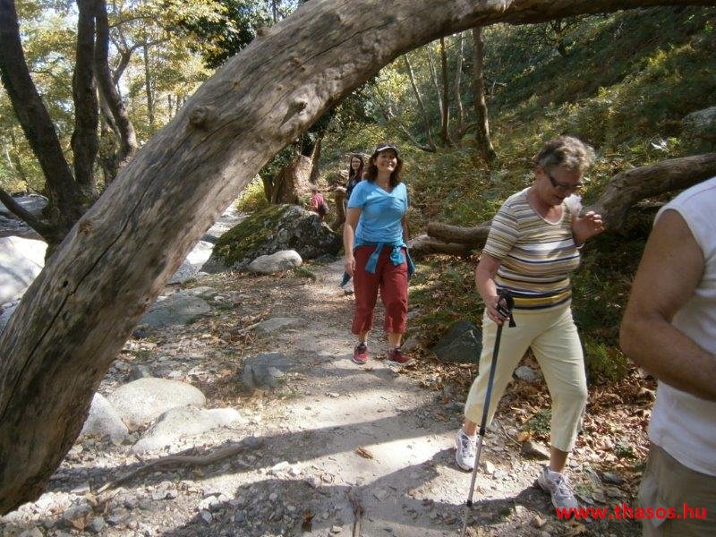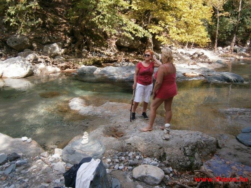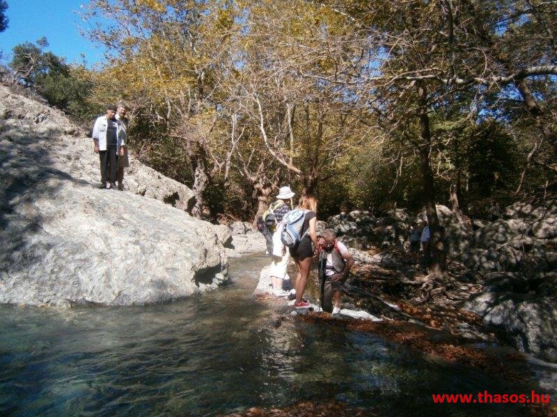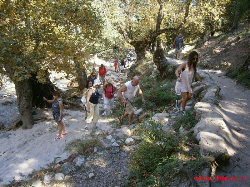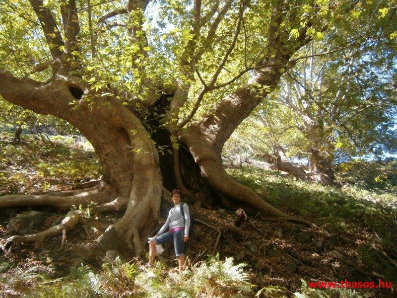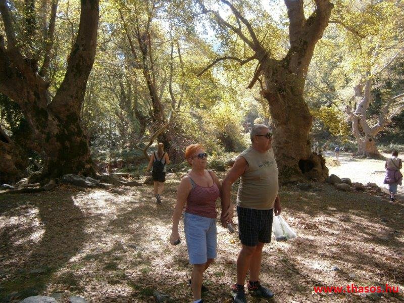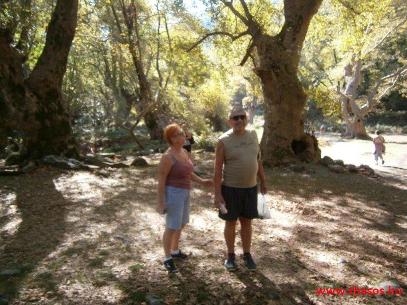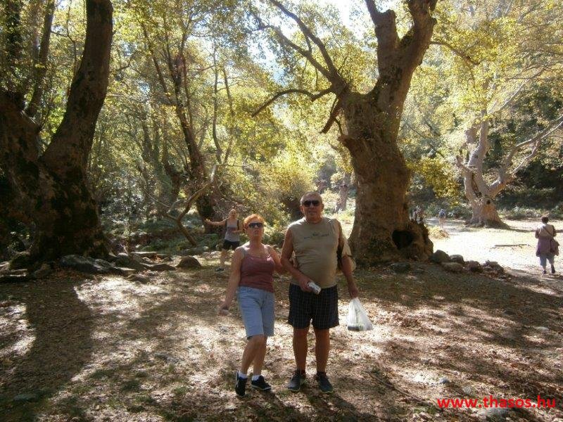 Gyalogtúra a Gria Vatrához. Ez kb 5 km-es nagyon könnyű gyalogtúrát jelentett a szállásunktól. Különlegességei a hatalmas platánfák voltak. Thassos szigetén is hatalmas platánfák nőnek, de ekkorát, mit ebben a völgyben, sehol nem láttunk még. Minden fája legalább tíz ember ölelésnyire nőtt. Ott sétálva termetes lombjai alatt valóban az az érzetünk van, hogy vidám erdei manók is laknak öblös törzseik odúiban.
