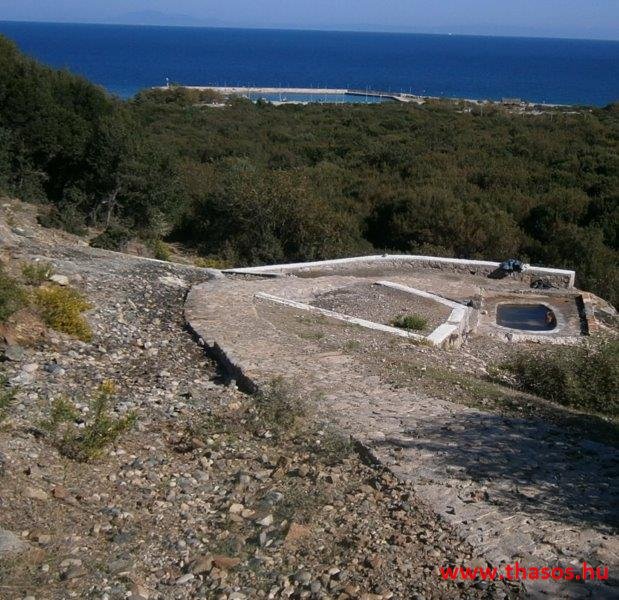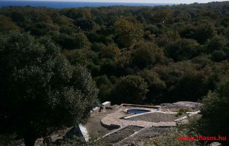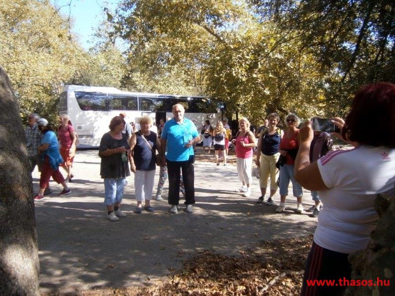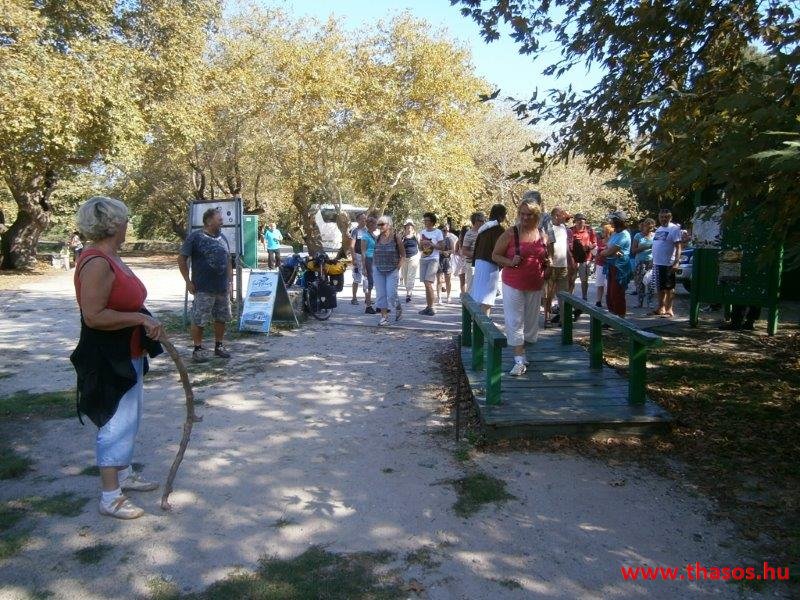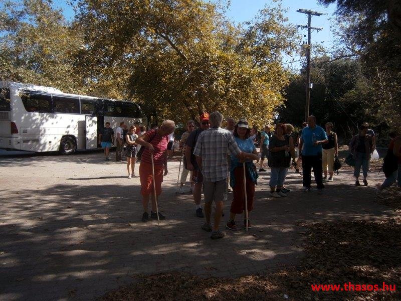 Így megérkeztünk az ásatás területére. Előző nap megtudtam, hogy a múzeum tető nélkül van javítás miatt, és a tárlati anyagok egy nem látogatható raktárban pihennek. Idegenvezetővel a sziget nem rendelkezik, azt Thesszalonikiből vagy Alexandroupoliból kellett volna magunkkal hozni. Csoportos jegyet nem adnak. Amit elértünk az eső miatt, hogy mindenkit 65 év feletti 2 Eurós jegybe vettek. A kapuőr csodálta az elszántságunkat, hogy ebben az ítéletidőben is nekivágunk az ásatás felfedezésének. Arra az információra támaszkodva, mit a honlapra feltettünk, az alapján és a kihelyezett nyilak alapján próbáltunk tájékozódni. Volt a területen három területtisztító munkás, kik a raktárfaházukba bújva mondták nekünk, hol van az első térkép a falba beépítve, hol van Filippos és Olimpiáda és Ptolemáiosz szentélye. Tőlük kaptunk pár, földdel szennyezett nylon zsákot, hogy azt a fejünkre téve immár bőrig ázva az autóbuszig jussunk. Az ásatási programunk így meghiúsult és az idő komolyra fordulva megfutamodásra késztette lelkes csapatunkat.