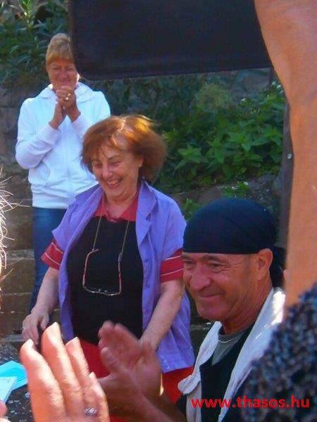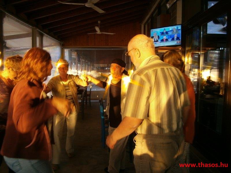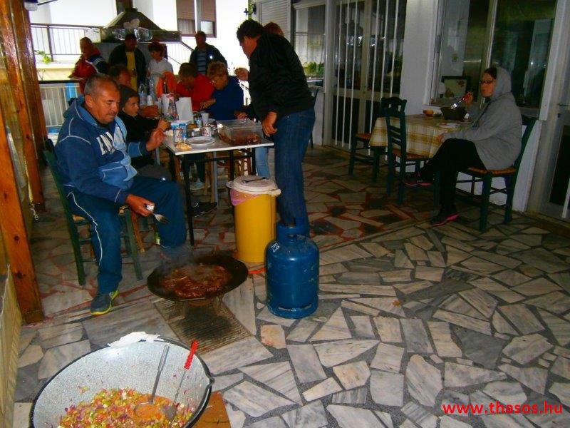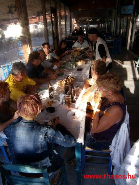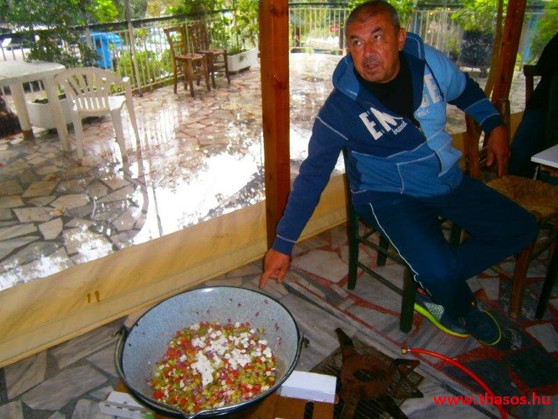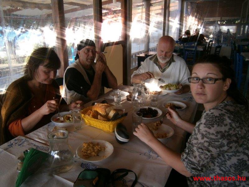Az estjeink mindig az éjszakába nyúltak. A falu helyi lakói mohó örömmel vártak vissza bennünket kiránduló napunkról. A tavernás Angelos úr illatos finomságaival várta, minél többen térjünk be hozzájuk. A csapatból lettek törzsvendégei is. A legtöbben azonban az égbenyúló platánfák közt felállított bográcsban főttet választották. A társaság lelkei ugyanis minden nap egy hatalmas bogrács ételt főztek. A csoport állandó tagjai még otthon összeaadták az egy hétre való napi 50 fős lakomák anyagát. Amikor túráztunk, akkor is volt, aki otthon maradt főzni, és utánunk hozták a finomságot.