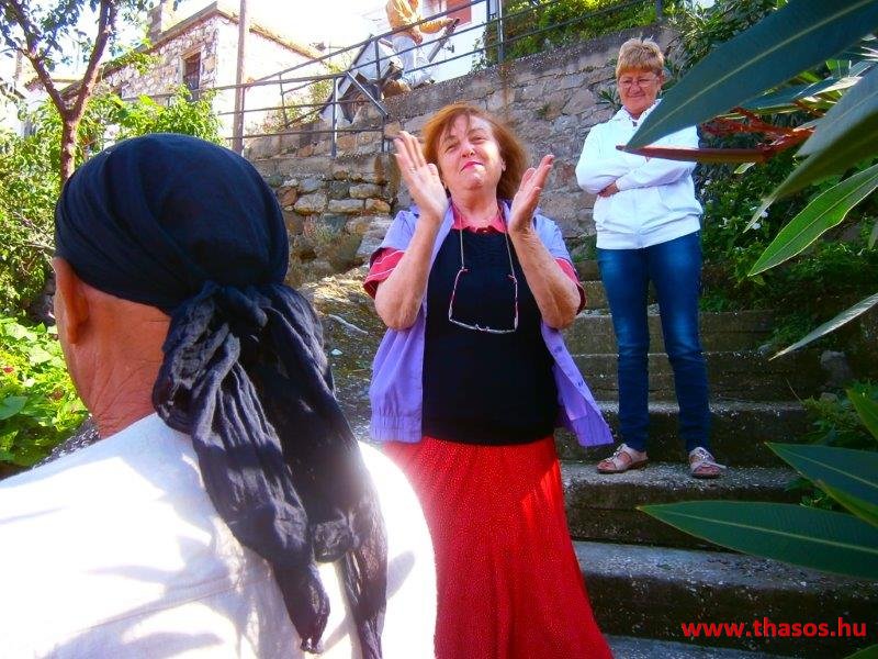 A háza oldalánál volt egy rom. Ő arra kiskecske módjára felugrott, rám parancsolva, hogy kövessem én is őt a rommagaslatra, hogy megfelelő színpadi képünk legyen. Annak részemről való megtagadását csak azért fogadta el, mert őt magát is a szélvihar csak úgy tartotta ott fent, hogy én a lábát tartottam lentről. Teljes hangerejével, min érződött, valóban színpadhoz szokott, hatalmas kedvvel szónoklatába kezdett görögül. Ízesen, humorral teli. Aki nem értette, mit mondott, az is élvezte a remek előadásmódja miatt. Elmondta élete történetét, munkásságát, beszélt kicsit a helyi életről, majd mielőtt beinvitált bennünket kicsi házába, énekelt is nekünk. Festőművész, grafikus, ír néprajzi és gyermekkönyvet. Színházi csoportban játszik felnőtteknek és gyermekekkel, népitáncol és énekel. A piros szoknyás hölgy képe Horából örökre él majd bennünk.