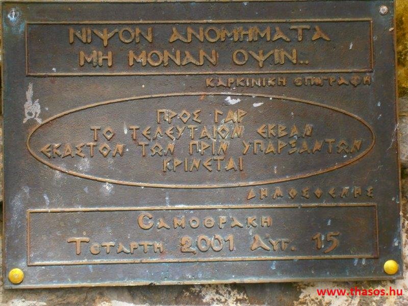 Nézzük meg a hagyományos házak és a sziget formáját. Thassos szigete szinte szabályos kör. Házai kicsi alacsony kockaformával épültek. A tetőzetük a súlyos palakő. Samothráki sziget formája keskenyen ovális kerek. Házai alakzata is ezt követi. Vékony, keskeny, belmagasságra alacsony, de szintekkel magasabb, mint a szomszéd sziget épületei. A házakat itt gömbölyű kolostorcserép fedi, mindegyiken egy-egy hegyi kősziklával. Mindkettő sziget ősi házainak formája azonosul a szigetükkel. Most a polipra vagy a tintahalra gondolok. Ők a tenger mélyének lakói. Csupasz testük védtelennek tűnik. Mit tesznek hát, hogy hogy eltűnjenek a veszély elől? Kövek közé bújnak. Színt és formát vesznek fel, hogy azonosuljanak a környezettel. A falvak és a házak az idegszálak. Jól védve, beágyazódva a sziklás környezetbe. Támadás így nem érheti. A gyomorból az epeszagú, mély lehelet és rángás a földrengés. Második éjjel ezt is érezhettük. Mélyből jövő ringással, kis lüktetéssel éberségre készteti az embert, kik a test sejtjeiként mindenhol vannak.