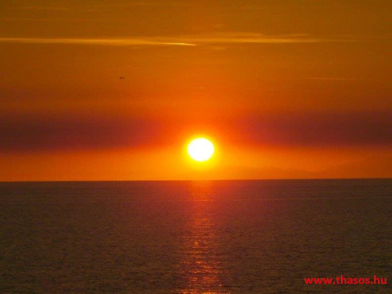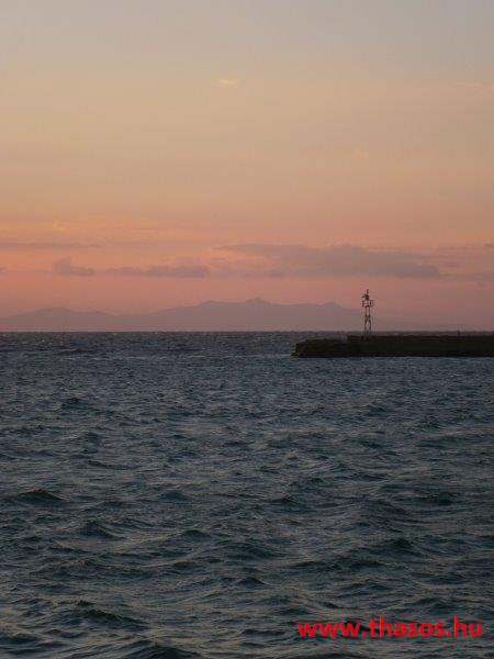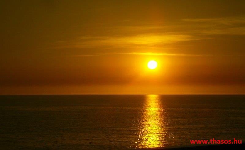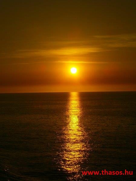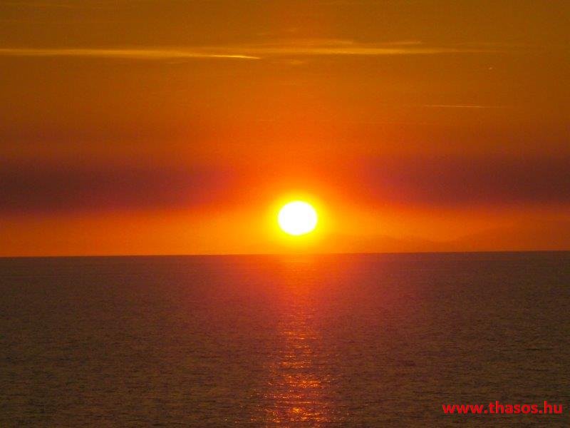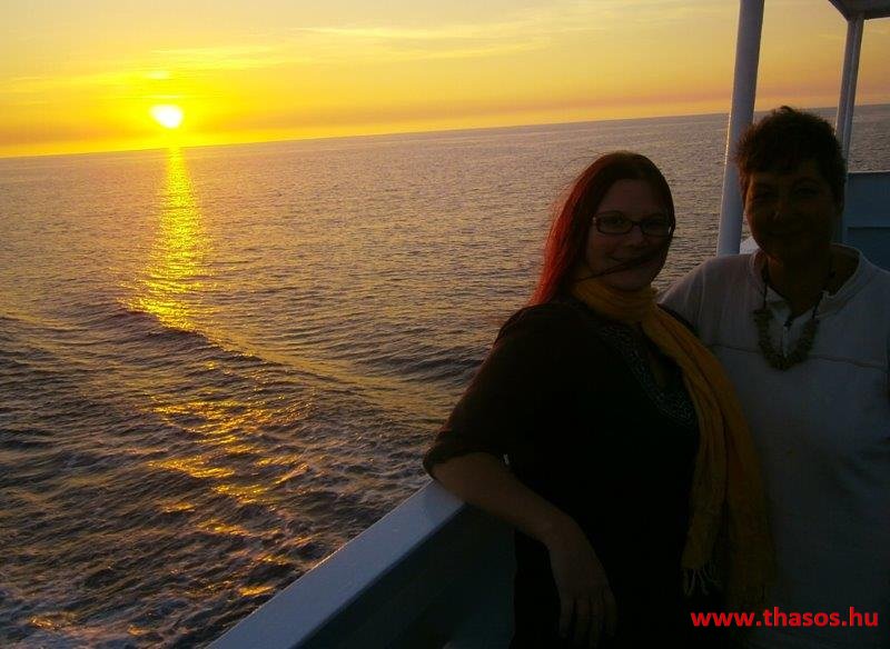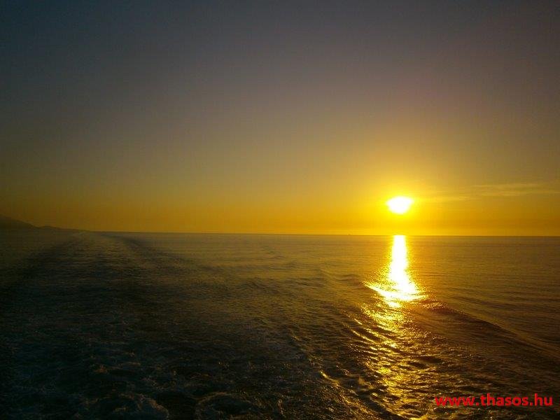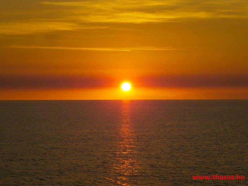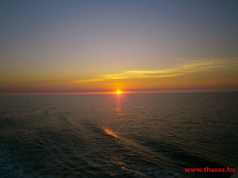 A nap mire nyugovóra tér, épp félúton vagyunk hajózásunknál. Épp Thassost világítja meg. Mögötte Athos vonalai is látszottak.