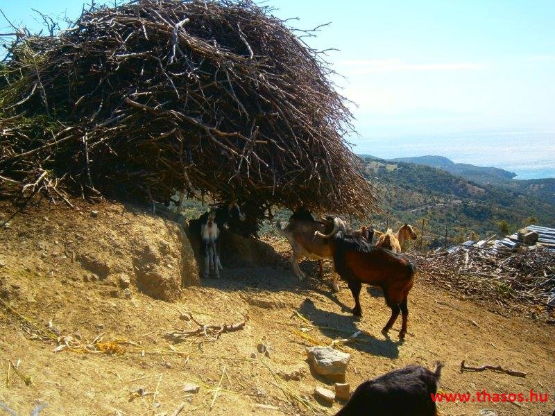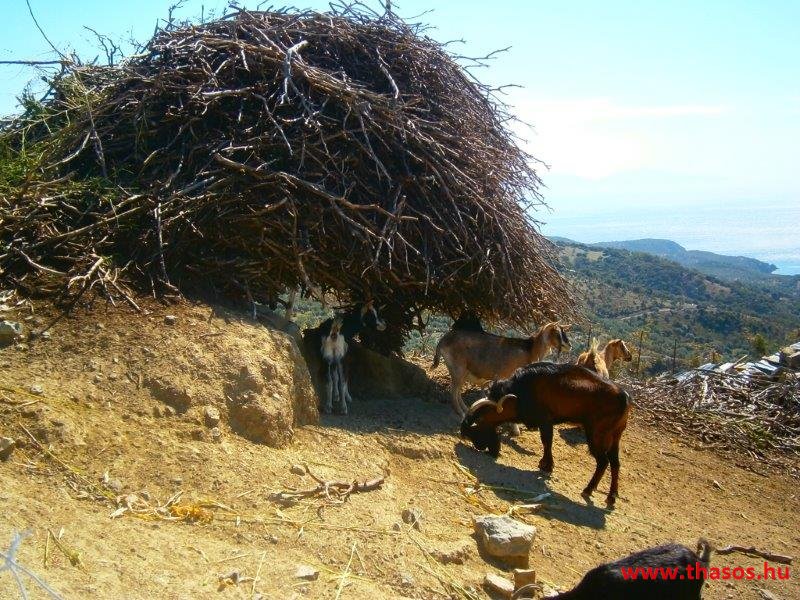 Vannak házak rajta. De a föld azt is csak akkor tűri meg magán, ha erősre, kicsire, vékonyra és alacsonyra építik. Mint egy kis présházat. Minden és minden vad rajta. Betöretlen. Próbálkozunk a partjait, a földjeit, a tengerét megszelídíteni, de az csak néha-néha egy pillanatra tűr meg rajta bennünket. Thassoson is a természet a domináns, de ott már uralja az ember. Lágyak a hegyeink, a patakjaink. Simogató a vize és ölbe vesz minden rejtett kis öble a tengernek.