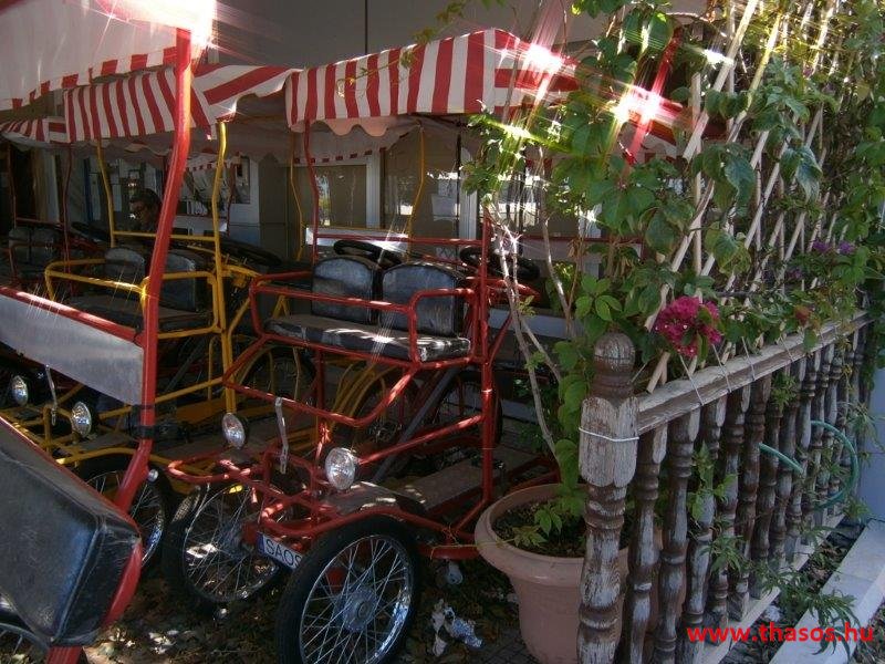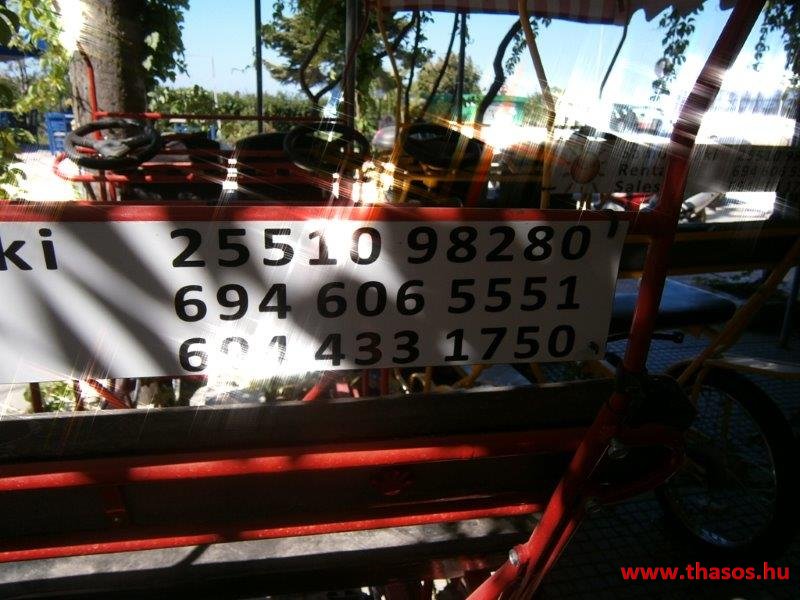 Láttunk még kerékpárt is. Érdekes jámű az. Kettő- és négyszemélyes „bicikli-autó” (Budapesten a Margit-szigeten bringóhintó ). Órára bérelhető. 5 Euró/fő/egy óra. Most nem láttuk, hogy bérelte volna valaki. Nyáron el tudom képzelni, ahogy a hippi tömegben ez is egy vidám színes színfoltot ad.