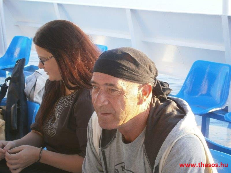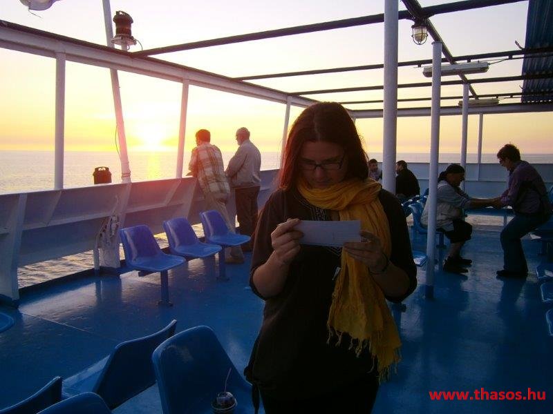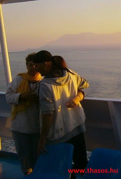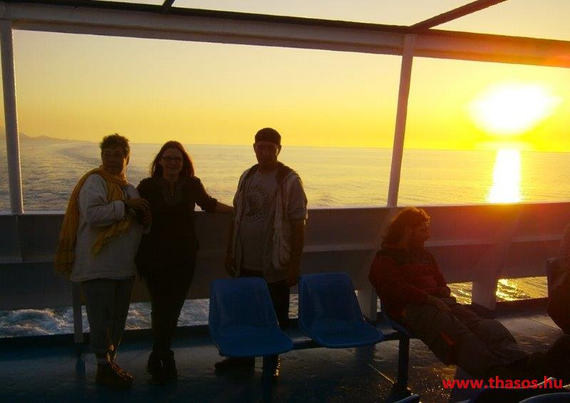 A vendégek már a hajón, a busz nem fér fel. Majd jön Pános barátja Thassosról. Pános kapitány és Ágathos kapitány. Thassoson elválaszthatatlan tengeri barátok voltak. Most itt a hajón újra együtt vannak. Az egyik, mint hajóskapitány, a másik mint vendégkísérő kapitány. Besegítik buszunk is. De a hajó még mindig nem indul. Már fél órát késik a tervszerinti indulástól. A hajószemélyzet újra kiszállít, majd beparkol járműveket. Naplementéhez közeledünk, mire végre elindul a hajó. Súlyos kövekkel és teli emberekkel. Kiürült a sziget. A falunk kóbor kutyái bánatos szemmel ültek a házaink bejárata előtt távoztunkra. A tenger eddig mindennap bodros hullámai immár megnyugodva, lágy ringással bocsátanak bennünket utunkra.
