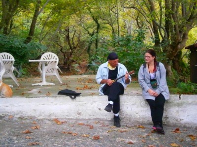 A hippivilágról talán negatív érzelmekkel írok. A narkót és a tisztátalanságot mutatták felénk. Biztos köztük is van olyan, kik e törvényeken kívüli életmód szerint élnek, és lélekben utazók csak. A falu közösségi házában fedeztünk fel egy ilyen kis csoportot. A szurdok bejáratánál állt a kicsiny temető mellett az öreg kőház, „Faluközösségi ház” felirattal. Az udvaron körben ült mintegy 14 fiatal, középen egy személy irányításával. Csendesek voltak. Szemmel láthatóan relaxált légzésgyakorlatot végeztek. Én illetlenül megzavartam őket. Tudom, hogy a szigeten nagy hagyománya van különféle szeánszoknak. A Kaviri misztériumok egykori szertartása ma különféle meditációs, relaxálós ceremóniában éli világát. Most mint megtudtam, az itt levő fiatalok egy egyhetes újjászületési meditáción vettek részt. Ez napi 5 órából állt, egyhetes időtartamú volt. A napi részvételi díj 50 Euró/fő. A mostani részvevők 4 ország nemzetének embereiből tevődtek össze. Haladó tanfolyamot tartottak.