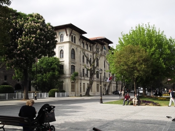 Végül elindultunk a tér hosszában, de nem körbe, hanem jobbra-balra csalinkázva. Mindjárt balra van egy rész a Hyppodrom eredeti falából, a török korban kutakat építettek ki itt, vagy tán eredetileg is kút volt. A szamárhát-ív mindenesetre török kori. Aztán egy eredeti, cca 500 éves török palota, ami ma a Török és Iszlám Művészetek Múzeuma. Mellette egy százéves épület – de jó, hogy a neten egy ismertetésre bukkantam, ami a kevéssé ismert részeket sorolta fel -, a szívem megmelegedett: ez volt a török birodalom kataszteri nyilvántartásának a központja, ma is Isztambul kataszteri (ingatlan-nyilvántartási) hivatala.