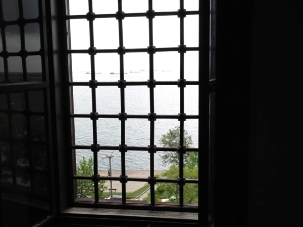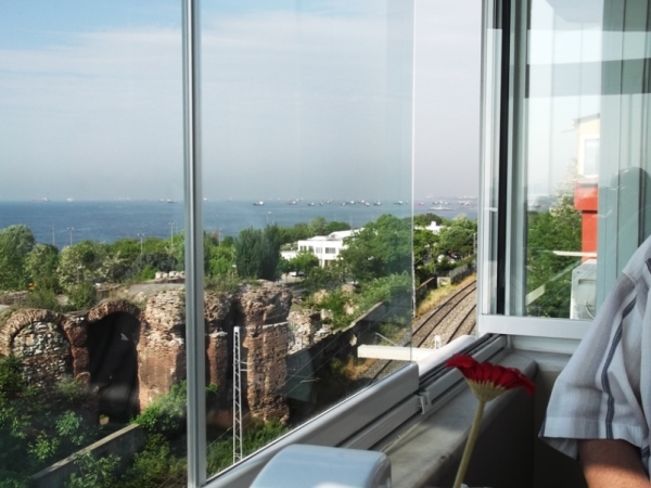 A mi hotelünk közvetlenül a vasútvonal mellé épült, azon az oldalon volt is némi zaj emiatt, de a kilátást nem zavarta semmi. Fölmásztunk a csigalépcsőn még két emeletet. Pici hotelnek pici breakfast room… a hét szobához négy asztal. De kicsivel 8 után még nem volt ott senki más. Először kibámultunk az ablakon. Ott előttünk a Márvány-tenger… ha jobbra nézünk, nem is látjuk a vizet a fehér hajóktól… lent a régi császári palotarom, a Bukoleon-palota… balra hátra kinézve a Kék Mecset egy része… Csak miután a szemünk jóllakott kissé – bár ezt a látványt nem lehet megunni -, kezdtünk foglalkozni azzal, mit is együnk. Tökéletes svédasztalt kaptunk, minden, de szó szerint minden volt. Emellé valamelyik reggel még kaptunk valami frissen sütött tésztaféleséget, másnap meg frissen sült zöldséget, a padlizsán íze még most is a számban van. De a legeslegjobb a kenyér volt. Mind a fehér, mind a barna szinte elröpült, és elolvadt az ember szájában. De a boltban vásárolt kenyér (ekmek) is finom volt.