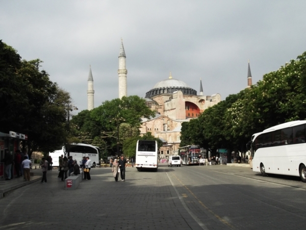 Az Aja Sofia. A keresztény világ legrégibb, legnagyobb épségben megmaradt székesegyháza. Ezer évig keresztény templom volt, félezer évig mohamedán mecset. Ma múzeum. Fenséges, hatalmas, masszív tömbje uralkodik a magaslaton, de nem nyomasztja, nem bátortalanítja el az embert. Belülről sem, pedig hatalmas a tér. Rengeteg mindenen lehet csemegézni odabent – ezt is úgy építették, hogy a római birodalom különböző sarkaiból odahordtak minden kész oszlopot, szobrot stb. -, minket igazán csak néhány dolog érdekelt. Például a szultáni imafülke két oldalán az a két gyertyatartó, amit Szulejmán szultán a budai Mátyás-templomból vitt oda magával szuvenírként még 1526-ban. Meg érdekelt volna az a mozaik, amin Szent László lánya, Piroska, bizánci nevén Iréné császárné látható. A galériára egy helyen föl lehetett menni, de ott fotókiállítás volt. A mozaikok a szemközti oldalon voltak, és ott is voltak emberek, de sehogy-sehogy nem sikerült megtalálni az oda felvezető utat.