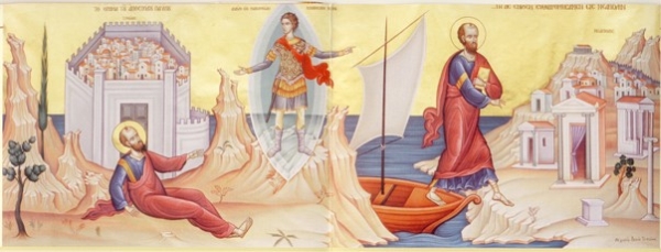 Rendezgettem a régi prospektusokat és a kezembe került egy Szent Pálról szóló görög prosi, Kavala-Philippi ismertetésével. Most akadt meg a szemem a képen - Pál apostol Troaszban (balra), megjelenik neki a makedón ifjú, majd partra száll Neapolisban (ma Kavala, a kép jobboldalán).