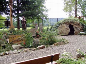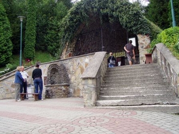 Végül innen is továbbmentünk, tovább a szomszéd faluba. Zwierzyń határában van egy csodatévő forrás. Többszáz évvel ezelőtt itt találtak egy keresztet, ami bizonyíthatóan francia földről származik. Aztán valami csoda is történt a forrásnál vagy kútnál, ezt sehogysem sikerült lefordítani. Pár éve építettek ide egy kápolnát Szűz Mária-szoborral, a forrást is kiépítették. Egyrészt mindenféle hasznos anyagot tartalmazó és nagyon finom, hideg forrásvíz, másrészt azt tartják, hogy védi a szemet. A falu végén egy keskeny hídon át kell menni a San felett, aztán elég keskeny út vezet a forráshoz. Az út mentén végig el vannak osztva a kálvária állomásai. Az utolsó 2-300 m elég vacak földút, de parkoló is van a forrásnál. Alig jutottunk vízhez – akkora volt a forgalom, hogy csak pislogtunk. A kápolna előtt ücsörögtek csoportok a már megtöltött edényeikkel, és folyton-folyvást jöttek újabb autók, és mindenki sok és nagy műanyag edényt hozott, hogy vizet vigyen benne. Valóban nagyon finom víz!