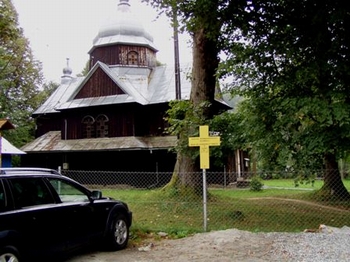 A következő két napra terveztem a keleti csücsök bejárását, különös tekintettel a sok-sok fatemplomra. Csütörtökön úgy kezdődött a nap, hogy a nap elbújt, csöpörögni kezdett, aztán egyre jobban esett. Elindultunk a térkép szerint az úton. Aztán egyszercsak útlezárás, terelés… igenám, de egy olyan útra tereltek, ami egyrészt kátyús, később biztosan földút, és az egyik térkép szerint le is van zárva. Mikor kezdtünk elmerülni a kátyúkban, visszafordultunk, és egy hatalmas kerülőt megtéve aznap két km híján 200 km-t mentünk, a két napra tervezett területen. Többnyire szakadó esőben. Némelyik temlomot nem találtuk meg, vagy későn vettük észre, vagy az út állapota miatt nem mentünk el arra… vagy már elég volt belőlük a nap vége felé. Azt sajnálom, hogy háromkupolás templomot nem sikerült megnézni. A terület közepe táján, Polana falu mellett van egy elhagyott falu, Rosolin, aminek az icipici templomát annak idején a sanoki skanzenben láttuk, a közelben meg van egy érdekes kis barlang a folyó mellett. Ezt meg akartuk nézni, de 2-3 km gyalogút földúton, eső után nem volt csábító, így elmaradt.
