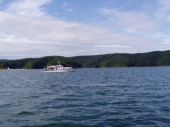Elindultunk nyugat felé. Aztán egyszer olyan helyre ért az út, ahol a folyón át kellett volna menni, de csak a szürkén rohanó vizet lehetett látni. Na, hát itt vissza kellett fordulni és másfelé menni. A Cisna-Lesko út mentén kicsit vissza kellett mennünk, megkerestük az erdész-vadász múzeumot. (http://www.muzeumknieja.pl/) Nem nagy, egy nagyobb terem kitömött állatokkal, de gondosan van megcsinálva. Mivel fotójegyet kellett volna venni, bent nem fényképeztünk, annyira azért nem különleges. Éppen bent volt egy busznyi lengyel turista, addig kísérletet tettünk a büfénél, kértünk bigost. Ez a lengyel káposztaétel eddig rendre elkerült minket. Nem a mi ízvilágunk ugyan, de jólesett, finom volt.