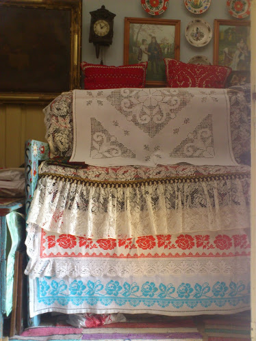 A festett bútorok, a mennyezetig halmozott párnák, a gyönyörű színes ruhaköltemények, a varrottasok púpozott halmaza között.