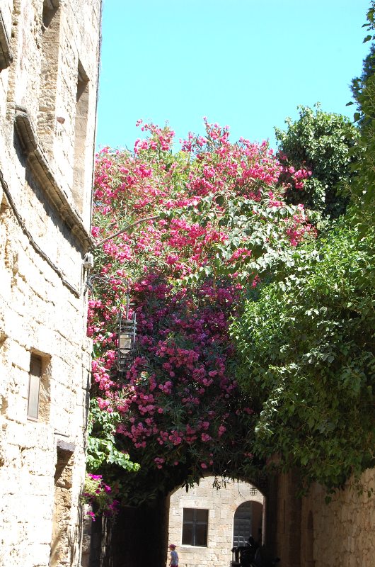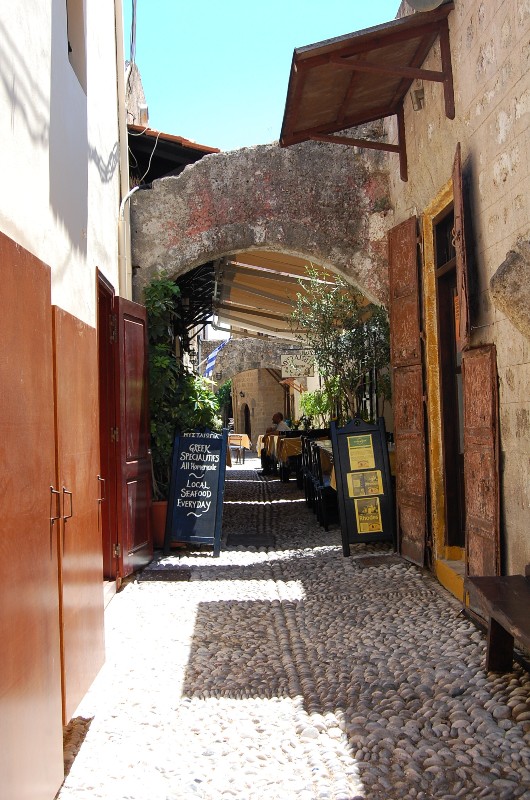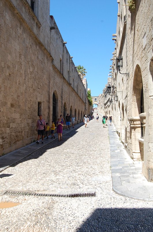 11 kapuja van a várnak, amit most használnak. Ki-be, körbe-körbe, ezt játszottuk 7 napon keresztül. Mindegyik kapu más-más kialakítású és kinézetű, és többnyire csak gyalogosok és robogók férnek át rajta. Az egyik kapu a Szabadság-kapu, ezen besétálva a Lovagok utcájához érkezünk, ez volt a lovagi élet központja egykoron. Napközben a Lovagok utcáján a turisták ezrei nyüzsögnek, ez egy kicsit zavaró, de este, mikor a lámpák kigyulladnak, az mindenért kárpótol, csendesebb, nyugodtabb a varázslatos atmoszférája, mi természetesen ezt is megnéztük és átéltük. A várfalon belül kizárólag csak lovagok éltek. Majd a török uralom idején csak a törökök és a zsidók élhettek itt. Mecsetek, könyvtárak között, stukkódíszítéses faerkélyek között sétálva egyszer csak a Hippokratész téren találjuk magunkat .Ez az Óváros egyik legjelentősebb találkozóhelye. A tér közepén egy középkori szökőkút, a tetején egy miniatűr minaret, amit sajnos a galambok sokszor ellepnek.