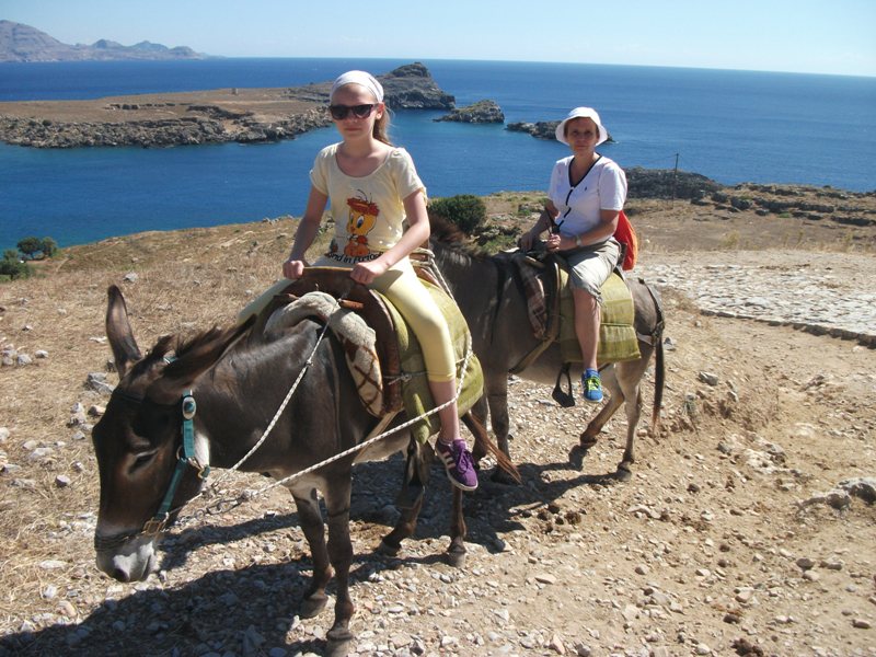 Nagyon jó kis kirándulás volt egy jól felkészült idegenvezetővel, aki az IBUSZ-tól volt, egy egész napos túra elé néztünk. Először megnéztünk egy kerámiakészítő műhelyt, majd Lindosz várát. A járművek többségét kitiltották a fellegvár alatti faluból, ezért a buszok fent egy parkolóban álltak meg. Innen séta a főtérig, majd a keskeny utcák útvesztőjén keresztül-kasul a lankás dombon, ahol műtárgyak, kézműves termékeket árusító üzletek sorakoznak, hangulatos bárok között séta a fellegvárig. Laurával csacsiháton mentünk fel, amit a főtéren lehetett bérelni vezetővel néhány euróért, ezt már itthon eldöntöttük. Nagyon nagy élmény volt mind a kettőnknek. Lindosz az egyetlen hely a szigeten, ahol még látunk egyszobás házat, melyet a lányos családok adtak az ifjú párnak (kivéve a török negyed). Az Akropoliszra vezető út meredek, de biztonságos. Elég fárasztó túra. Ezért mentünk mi csacsival. A csacsik egészen más úton haladnak. Annyira figyelnek a tisztaságra, a turistákra, ahogy egy csacsi kiengedte, ami felesleges, azonnal jön egy ember és takarít.