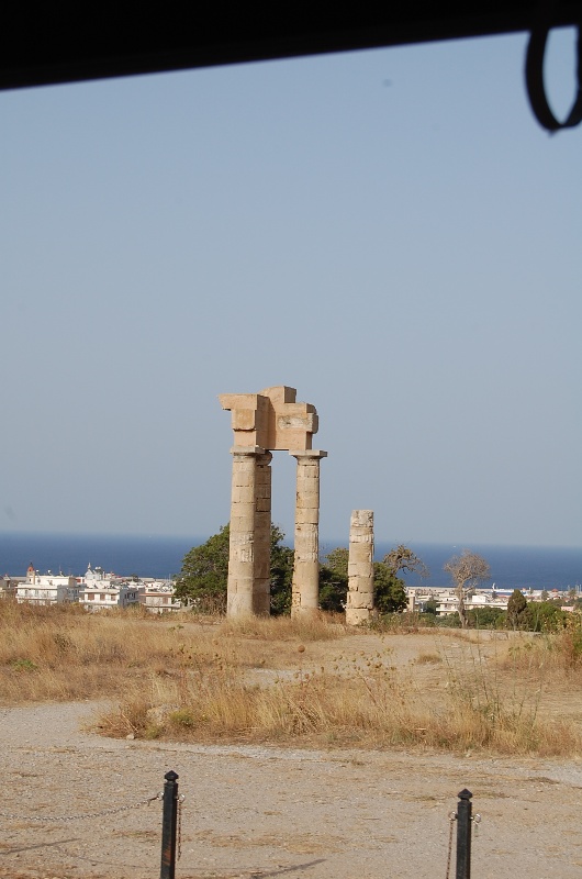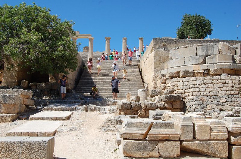ahonnan egy 20 méter széles lépcsősor vezet a propüleiához, ami a szentély bejárata. Csodálatos a kilátás innen északi irányban a lindoszi öbölre, nyugatra pedig a város és a római kori színház maradványai látszanak. Jól éreztük itt az ókori falak között magunkat.