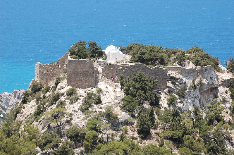 A fellegvárnál találkoztunk a csapat többi tagjával és csatlakoztunk hozzájuk. Nagyon szép hely, igazi ókor sokkal kevesebb mű elemmel, mint az athéni Akropoliszon. A várban meredek lépcsősor korlátok nélkül. A lépcsősor tetején a gótikus parancsnoki palota. A hegyfok csúcsán a XV.sz.-ban épült Szent János templom maradványai, innen egy tágas teraszra jutunk,