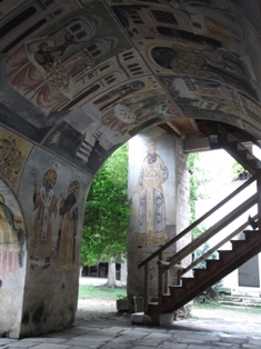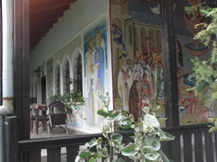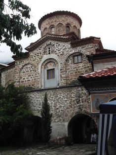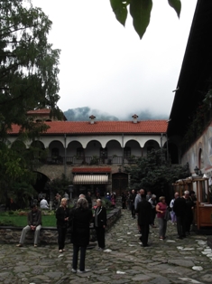 Ezután visszakúsztunk a viharvert úton, és folytattuk utunkat dél felé, a bacskovói kolostorhoz. Ezt is az Aszen cárok idején alapították, de a régi épületekből talán egy maradt fenn. A török időkben nagyrésze el is pusztult, de később újjáépítették. A völgyből indulva egy patak mentén föl lehet menni először egy vízesésig, majd följebb egy barlangig. A középkorban a török elől eldugták a kolostor csodatévő szentképét egy barlangba. Többszáz év után találták meg, kápolnát csináltak a barlangból is, meg eléje is építettek egyet. Na de ez nem nekünk való túra, meg időigényes is. Maradt a fizetős parkoló, onnan a séta a kolostorig. Sokan voltak, bent az udvaron is mindenütt emberek. A templomba nem tudtunk beférni, mert a bolgárok hosszú-hosszú sorban álltak és vártak arra, hogy bemehessenek. Hátulról kotkodácsolás meg kukorékolás hallatszott… de ettől függetlenül is olyan otthonos hangulata volt az egész helynek. Kisebb, mint a rilai kolostor, vagy csak kisebb részt lát belőle az egyszerű látogató.