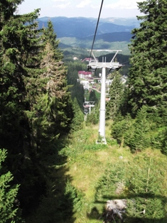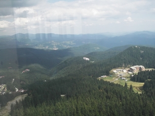 Tovább. Pamporovó, a síközpont volt a cél. A Sznezsánka-csúcsra a legfelső sílift működik nyáron is és hétfőn is. (Hétvégén még két felvonó üzemel.) Megtaláltuk az állomását, fellibegőztünk a csúcsra (a mi jánoshegyi libegőnknél úgy másfélszer-kétszer hosszabb és magasabb). Majd a tévétoronyban föllifteztünk a büfé szintjére. Onnan még egy szintet föl lehetett volna lépcsőzni a nyitott teraszra, de ahhoz valahogy nem volt gusztusunk, inkább csak üvegen keresztül bámészkodtunk és fényképeztünk, és kajáltunk, hogy legyen jogcímünk ott ücsörögni.  A világ tetején… 2019 m magasan.