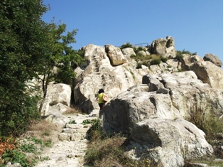 A parkolótól (ott barátkozott velünk egy kis vörös cica  ) kiépített turistajárda vezet a szentélyhez. Ez nincs olyan magasan, mint Perperikon és kisebb is. De ez is tekintélyes méretű, és innen is szédítő lenézni az alant elterülő mezőre. Ez is az elmúlt évezredek tanúja. Magát a sziklát itt is csak az eredeti, kőbe faragott lépcsőn (már ha ez igazából lépcső – megmászható, de egyenetlen… ) lehet meghódítani.
