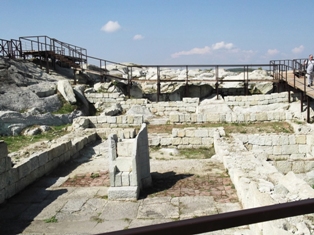 Bár a hely honlapján azt olvastam, hogy ingyenes a belépés, mert egy nagy bank szponzorálja a kutatást, kértek belépődíjat. (Nem sokat, és sajnos, az árakra már nem emlékszem, de sehol sem volt sok.) Innen egy darabig meghökkentően vacak ösvényen kell felkapaszkodni, aztán rátérünk a szépen kikövezett turistaútra. Egy helyen elágazik – két helyen lehet fölmenni, aztán az ellenkező végén meg lejönni. A kikövezett járda (csillog, mert a helyi ásványokkal készítették) után falépcső következik, mint általában a várromoknál. Aztán elfogy a falépcső és marad a sokezer éves, sziklába vájt eredeti lépcső. Tapadós talpú lábbeli, túrabot… láttam fiatalabb nőt a kis semmi topánkájában szenvedni, a pacákja alig bírta felhúzni fokról fokra. És hát ezeken a sziklákon kell továbbmenni. Pont szemben egy igen meredek kövön ott virít a turista szemébe a majdnem függőlegesen vájt lépcső. Nem lehettek az akkoriak különösebben reumásak, ha ezeken szaladgáltak föl-alá… Ez az ősi, legrégebbi része a szentélykomplexumnak. Egy helyen meg van jelölve Dionüszosz oltára. Aztán a járat felvisz a sziklák legtetejére, itt már látszik, hogy a folytatásban épített falak is vannak, és még jókora területen lehet bóklászni. Én végül végig se jártam…