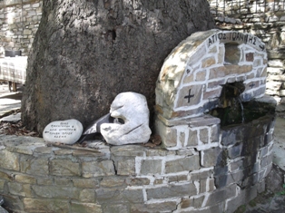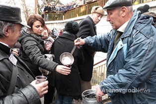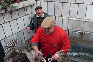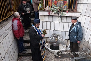 Az utunk Kardzsali felé Aszenovgrádnál ágazott el, tehát vissza kellett menni a városba. Megkerestük az Angyali Üdvözlet templomát, annak is az utca felőli kútját. Információkeresés közben, mikor aszenovgrádi képeket nézegettem, feltűnt egy kép, egy kutat ábrázolt, ahol halfejekből folyik a víz. Kell hogy legyen valami jelentősége, ha lefényképezték… Addig kutattam, amíg találtam egy újságcikket, ami szerint pár éve csőtörés volt ott, és arra gondoltak a helyiek, hogy helyreállítják a kutat és felelevenítik a régi hagyományt, ami szerint Szőlőmetsző Szent Trifon napján bor folyik a kútból   Azt nem tudtam a bolgár szövegből a google-fordítóval kisillabizálni, hogy csak a felavatáskor vagy minden évben Szent Trifon napján megtörténik-e a szertartás… de találtam képeket, amin a pap éppen megáldja a cuccot, aztán kis poharakban osztják a bort az ott álló híveknek