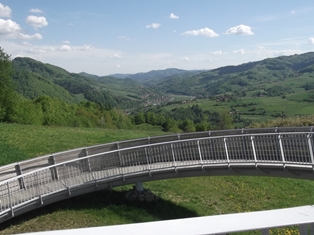 Átmentünk a Poprád folyón, felkúsztunk egy hegycsúcson épített kilátóhoz. Nagyon jópofa, egy köralakú járdát építettek, körbe lehet járni. Mellette pihenőhely. Van még egy fakuckó… gyanús lett… igen, egy toi-toi mobilvécét burkoltak be jópofa, érdekes burkolattal, hogy ne ríjon ki a környezetből.