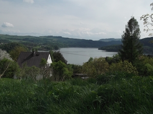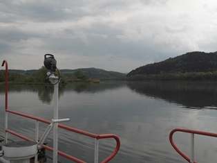 Szombat reggel esett az eső, egészen délig. Akkor azért összekaptuk magunkat, és elindultunk csavarogni. Kicsit északabbra a Dunajecen egy nagy víztározót duzzasztottak föl, azt jártuk körbe. Először megláttuk Tropsztyn várát, fellobogózva, de nem volt rendes parkolóhely a bejáratnál, így nem álltunk meg, azt meg nem tudtuk, hogy pár méterrel odébb komoly pihenőhely van kialakítva. Mentünk tovább, nem messze van egy komp, át a folyón/tavon. Három autó fér rá. Egészen megdöbbentő módon nem kellett fizetni!