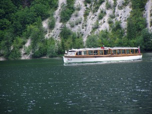 Egy alkalommal (itt már az ilyen rövidebb idejű dolgok időrendi sorrendje keveredik bennem, de úgyse az a lényeg) körbesétáltuk a tavat. 2-3 óra alatt meg lehet tenni. Elindultunk, aztán ahogy beértünk az úton a fák közé, megdörrent az ég. Tényleg mennydörgés volt??? azért mentünk tovább. Igen, jöttek a felhők is, csak olyan hegyes vidéken nem lehet korán észrevenni. Mentünk-mentünk, elkezdett csöpörögni, aztán jobban esett… de akkor már úgy nagyjából félúton voltunk. Mire igazán rákezdett, a kanyar után elénk tárult egy sport-lelátó, a fele részén tetővel. (Evezős versenyeket szoktak tartani a tavon.) Boldogan vettük tudomásul, hogy a szemközti szigetről, a kegytemplomból a csodatévő Szűzanya megsegített minket… Letelepedtünk, de lyukas volt a tető, odébb kellett ülnünk… megvártuk, amíg elállt a zuhé, mások is élvezték a menedéket.