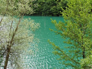 De még eznap volt – akkor a Bohinji-tóhoz mentünk. Megálltunk a tó elejénél, ahol a híd közelében áll a középkori, azt hiszem Keresztelő Szent János-templom, de amilyen a formánk, persze nem volt nyitva. Aztán átcsurogtunk a tó ellenkező végére, ahol a kemping van. Onnan látszott a sziklán a vízesés, ami a … folyó forrása, oda is föl lehet menni, meg valahova felvonóval is a hegy tetejére, de annyira már nem vagyunk kalandvágyók. Viszont jó lábú fiataloknak jó program. A Bohinji-tavon jár kishajó a tó hosszában. Valahol vannak ám házak az erdőben, de a fáktól egy se látszik. Csak a magányos, a zöld fákat visszatükröző víztükör. Biztos van a parton valahol strand is, de mondom, ráadásul …xxx hideg volt aznap.