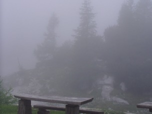 Fölértünk a hágó tetejére. Ott van parkoló, mert följebb van turistaház is. Kiszálltunk kicsit. Brrrrr! Én hülye, nem vettem föl a kabátot! tudod, milyen hideg volt??? Léptünk párat erre-arra – és hirtelen leereszkedett ránk a felhő! Egy vagy két perc alatt! Először még láttunk valamit, aztán már jószerivel csak az orrunkig… és még hidegebb lett… Beszálltunk az autóba, de nem mertünk elindulni, aztán később mégis szerencsét próbáltunk, és kis távolság múlva ki is értünk a felhő alól. Az orosz kápolna érdekelt volna, na de ilyen szerpentinen arra figyelni, hogy hopp, elhagytuk, és nincs is hol megállni?