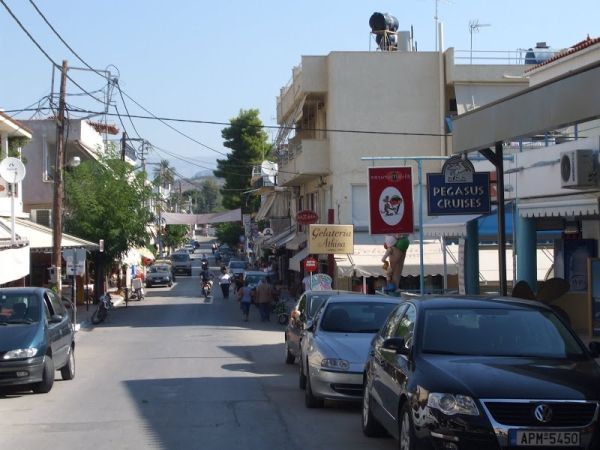 Mivel éppen a falu közepén lakunk, egyből dönteni kell, hogy melyik irányt válasszuk. Végül Assini felé indulunk, a főutcán, sétálgatva, nézelődve. Szépen lassan haladva eljutunk majdnem az öböl végéig, amikorra is már nagyon melegünk van, itt a hűsölés ideje. Előbb betérünk egy kis büfébe, ami klasszul árnyékolva van felülről, és belülről hűtjük le magunkat. Ki ezzel, ki azzal, én egy frappéval. Majd átsétálunk a túloldalra, és ott rögtön le a vízhez.