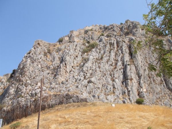 Aztán autóba pattanunk, és megcélozzuk az első felderítendő látványosságot. Kb. 1 óra alatt érünk az Acrokorinthosi vár alá, és némi hezitálás után be is kanyarodunk a felfelé vezető útra. A vár egy domb vagy hegy tetején áll, messziről csak a domb látszik, olyan, mintha egy kőgolyó állna magányosan. A kőfalak annyira beleolvadnak a háttérbe, hogy csak közelről látszik, hogy van valami a tetején.