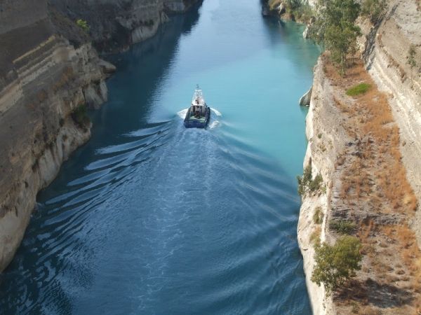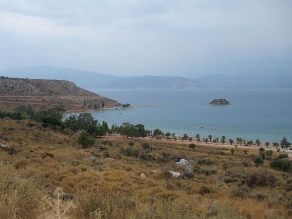 Bemegyünk a mai Korinthos városába, és amennyire lehet, a tenger mellett haladunk, mert először az öböl felől szeretnénk a csatornához jutni. Beleszaladunk egy-két egyirányú utcába, és a forgalom is elég nagy, de ehhez képest könnyen odatalálunk.