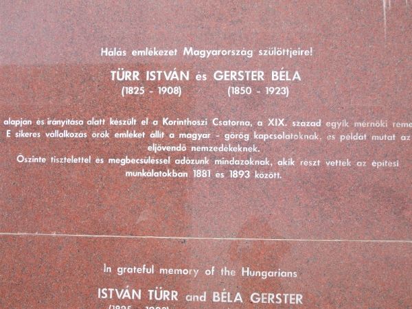 A hajóval együtt a tömeg is eltávozik, és mi odaférünk a márvány emléktáblához. Ezt is muszáj lefotózni, hiszen a magyar tervezőknek állít emléket, Türr Istvánnak és Gertser Bélának. A táblán szerepelnek a csatorna különféle paraméterei, az avatás dátuma három nyelven: görögül, magyarul, angolul. Mellette egy kis ágyásba ültettek egy kis bokrocskát, néha-néha locsolják is, de nagyon csenevész szegényke. A „derekán” magyar nemzeti trikolor feszül, ezt is lefotózom.
