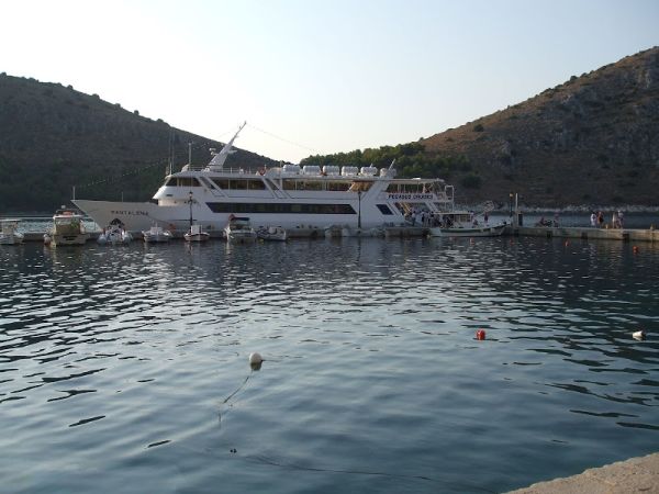Lassan apadni kezd a hangulat, mert az első megállónk messzi van, 3 óra az út. A mellettünk lévő asztaltársaság apró csínnyel próbálja ébren tartani a csapatot. Valaki szájából elhangzik a DELFIN, DELFIN kiáltás. A hatás azonnal mutatkozik, emberek riadnak fel bambulásukból, felpattanva székeikről, fotómasinával a kezükben a korlátokhoz csörtetnek. Persze, delfin sehol. Az elkövetők próbálják magyarázni, hogy hol is látták, de hamarosan nyilvánvalóvá válik, hogy semmit sem láttak. Aztán lenyugszanak a kedélyek, és már mindenki csak azt várja, hogy végre kikössünk.