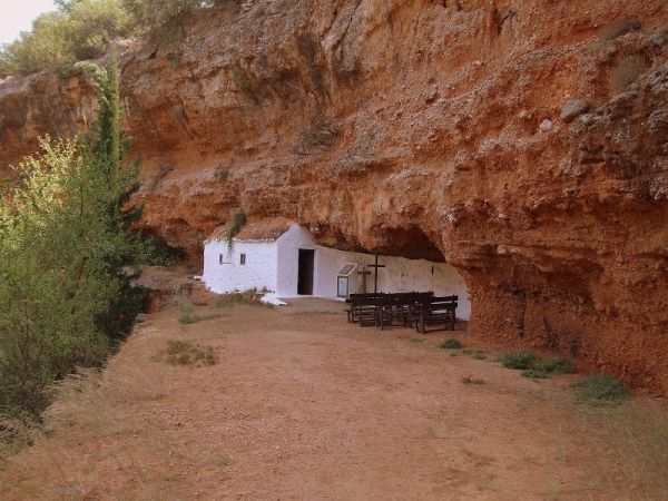 Földbe vájt, keskeny járaton jutunk a belsejébe, meredek lépcsőkön. Nem olyan hosszú a tárna, hogy világítani kelljen, és a fehérre mázolt falak is segítenek a tájékozódásban. Először egy kis erkélyfélére jutunk ki, ahonnan még néhány lépcsőn érünk le, véleményem szerint egy belső széles peremre, nem teljesen a kráter aljára. Azonnal szembeötlik egy kis fehérre meszelt kápolna, melynek csak a külső fala épített, a többit maga a szikla alkotja. Előtte kint padsorok a hívőknek. Annyira elüt a környezettől, de mégis, valahogy nagyon idevaló.