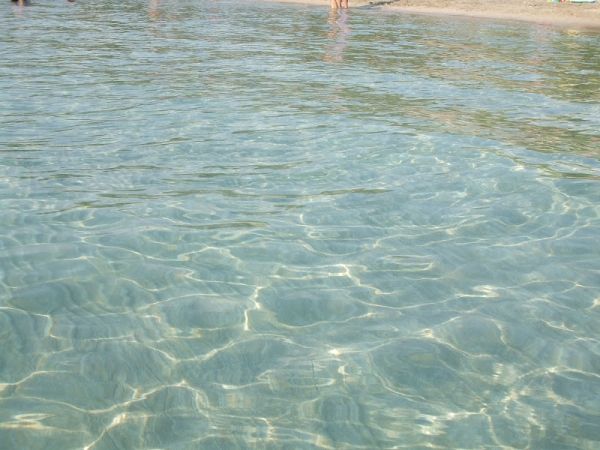 Aztán fürdőrucit öltünk, és lesétálunk a partra, megmártózni a tengerben, végre. Kilépve a kapun, még 10 egész métert kell mennünk, és már meg is érkezünk. Ezen a részen keskeny parti sáv van, a házak szinte belelógnak a tengerbe. Viszont nincs tömeg, mint a kiépített nagy strandokon. Általában a közel lakók járnak ide pancsolni. A víz lassan mélyül, és csak az elején van egy kis kavicsos, köves sáv, aztán már csak a finom homok. Gyönyörű tiszta, és csak kicsit hullámzik. A hőmérséklete is pont megfelelő.