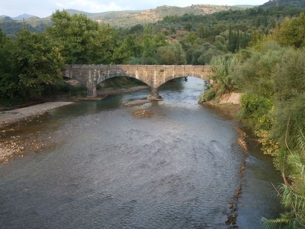 Meglátjuk az íves vashidat, amit szintén láttunk már képeken, és nincs is messze. Megpróbálunk a közelébe jutni, hogy onnan nézelődhessünk. Nem megy elsőre, de aztán csak megleljük a módját. Földúton jutunk el mellé, autóval a hídra felhajtani nem lehet, mert földhányásokkal el van barikádozva. Abban sem vagyok biztos, hogy elbírna egy kocsit. Mi úgysem akarunk átmenni, csak nézelődni, viszont a leleményes görögök ezt is megoldják, kis ösvények vannak a földhalomban, amin már könnyedén átjárhatnak robogóikkal. Saját szemünkkel is láthatjuk. A túloldalon rég elhagyott katonai őrállások vannak, bunkerszerű építmények, párom szerint géppuska-fészkek, és nem kevés. Biztos volt idő, amikor szigorúan biztosítani kellett a környéket. A lezárás is biztos emiatt van, vagy volt.