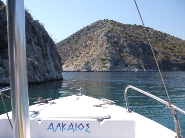 Szépen lassan megtelik a bárka, felberregnek a motorok, útnak indulunk. Néhány perc üldögélős nyugalom után egyre inkább felbolydult méhkasra hasonlít a társaság. Mindenki jön-megy, nézi a tájat vagy a fodrozódó hullámokat. Az egyre távolodó Tolo is lenyűgöző látvány, kattognak a fényképezőgépek, forognak a kamerák. Nekünk, tengertelen országból jövőknek maga az előttünk lévő végeláthatatlan tenger is óriási élmény. Fent egy picit fúj a szél, de senki sem bánja, csak bámuljuk az előttünk elterülő víztömeget. Még nem szállt fel a kora reggeli pára sem, így foltos szürkében játszik a mellettünk elmaradó hegyek és dombok sziluettje. Még nincs hőség, de a hőmérséklet szinte percről percre emelkedik.