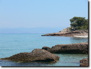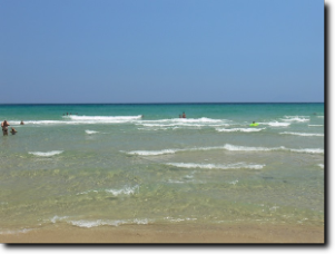 A szállás elfoglalása és egy kis pakolódás után a gyerekek legnagyobb örömére még vacsi előtt lesétáltunk a partra fürödni egyet. A szállásunk kertjéből közvetlenül lehetett kijutni a partra. A gyalogút két ház között vezetett és kb. 50 m-es volt.